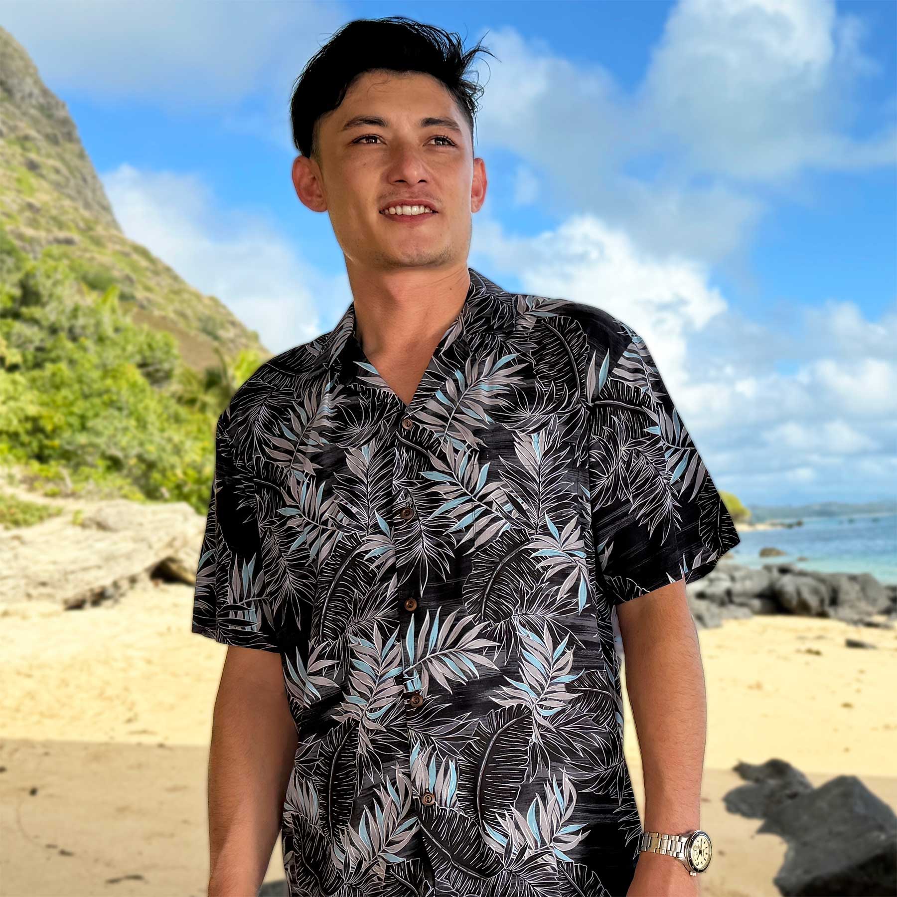 Unlock luxurious elegance with this Midnight Palm black Aloha shirt. Featuring distinctive palms and leaves on an enchanting black background, this shirts creates a statement-making look with a sophisticated edge. Express your laid-back style on any occasion in this striking Hawaiian shirt.