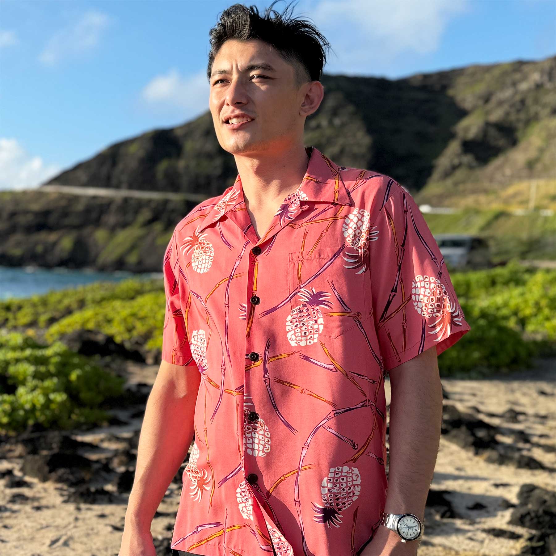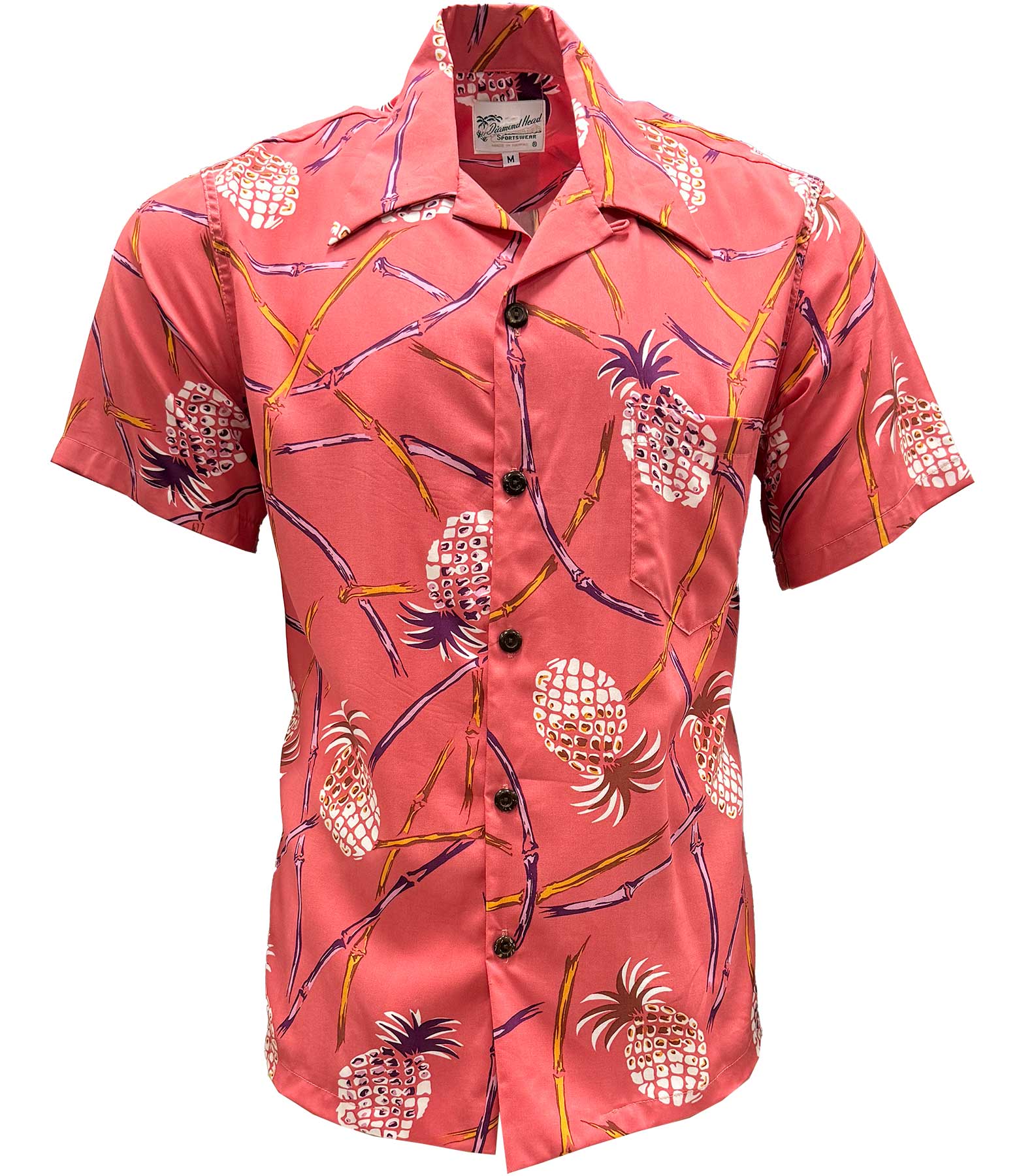 This Retro Pineapple Bamboo - Coral aloha shirt features a stylish vintage-inspired pineapple and bamboo design on a vibrant coral background for a fun and sophisticated tropical look. Made of fine rayon fabric, it offers a soft and comfortable feel, perfect for any occasion. Embrace the luxurious and tasteful vibe of this piece, reminiscent of a bygone era. This handsome shirt is made of 100% rayon and has a matched pocket and real coconut buttons.